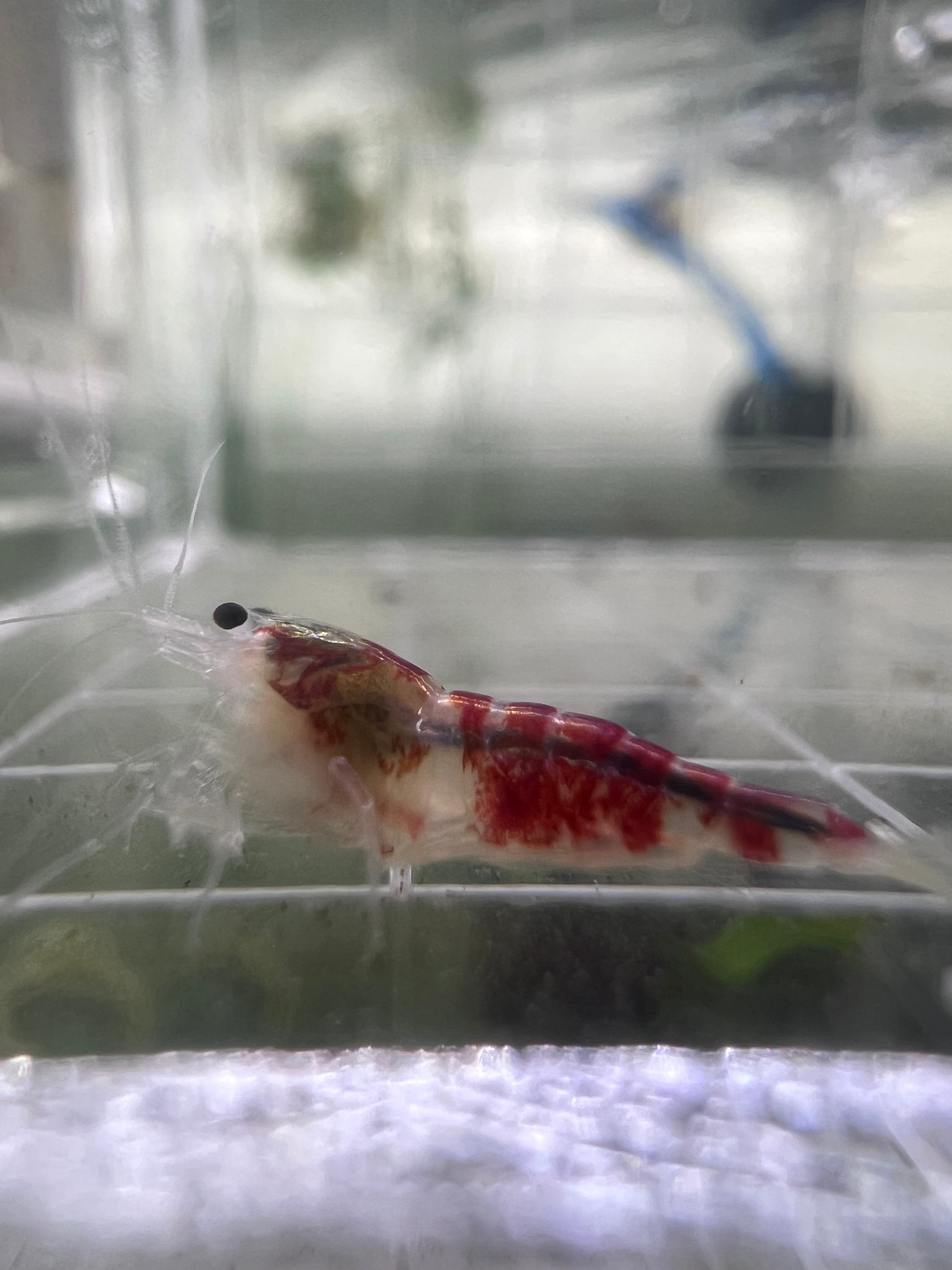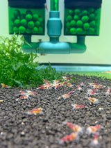 Diet: Biofilm, specialized shrimp foods, blanched veggies